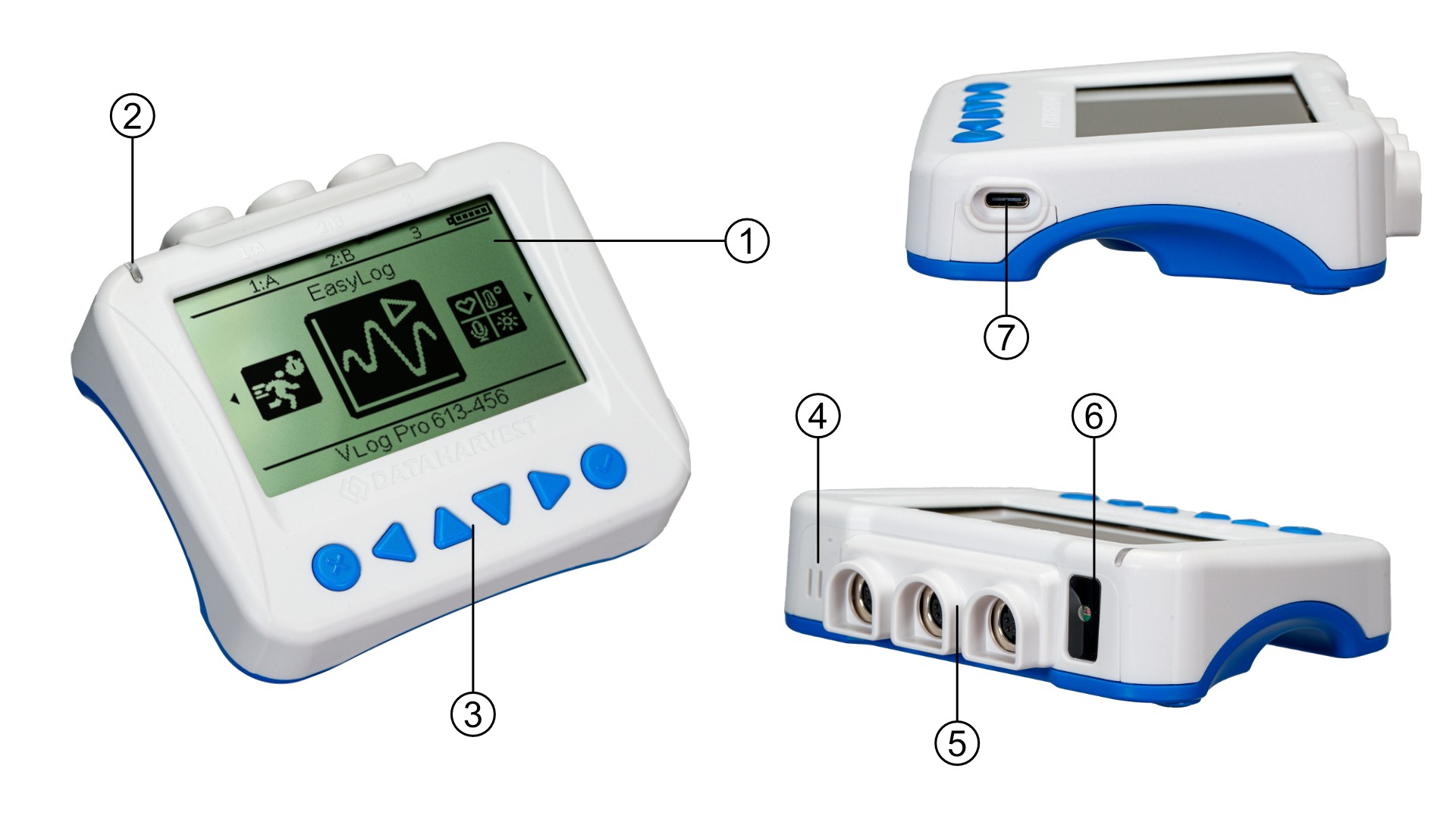 The USB port is used to provide a hardware connection to a collection station, and to provide the means by which V-Log Pro can be charged.